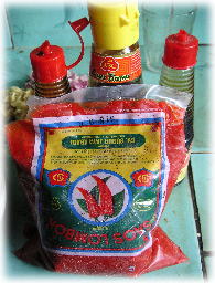 ↑ そして、何と言っても決め手はこのSAOS LOMBOK。 これは、ミー・ゴレンやナシ・ゴレンの赤味の元で、 トマトケチャップに唐辛子の辛味を加えたようなものです。 |