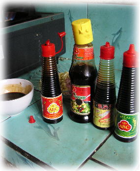 | (写真左から) KECAP MANIS/ケチャップ・マニス・・・少し甘いソース。 SAUS TIRAM/ソース・ティラム・・・中華料理で使うオイスターソースのようなもの。 SAOS RATU RASA/ソース・ラトゥラサ・・・海老の風味のあるお醤油のようなもの。 KECAP ASIN/ケチャップ・アシン・・・少し辛いソース。 |