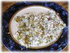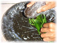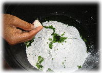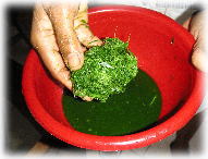 ↑もち米の粉などに、この絞り液とお塩を少々入れて、 耳たぶぐらいの硬さになるまで捏ねます。 |