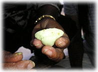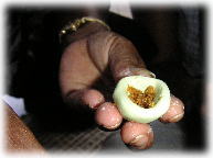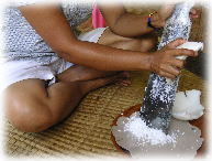 ↑まずは、ダウン・カユ・スギッと言う葉っぱを石うすでゴリゴリ。 お金持ちと言う意味があるらしい葉っぱだそうです。 これを食べたらお金持ちになれるかな〜?^0^ |