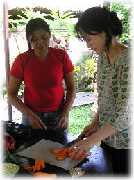 そもそもこのリンドゥハウスで料理教室ができるとは思っていなかった。 私は別の目的があってバリを訪れたので、それ以外何をするという目的があったわけではない。 食べる事が好きな私はちょいとインドネシア料理でも作ってみたいと思い、観光本でそのような教室があるのか調べて見た。 ところが紹介されている教室は$表示の高いものばかり。ちょっとした家庭料理でいいのにそんなに高いのかー。 などとボヤいている時にこのハウスの住人ユキさんが「ここで料理習ってみる?」と話をもちかけてくれてラッキー。 ここのキッチンでできるというお手軽さもあり、チョイ入門にはうれしい限りである。 |