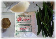 材料となるヤシ砂糖・ココナッツ・もち米の粉・ダウン・カユ・スギッ(左から) |