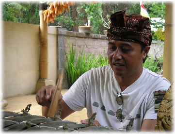 I Ketut Gede Arta 43歳(通称:アルタさん) 日本語のガイドでもあるアルタ先生は、 観光の勉強をする為に日本の広島・東京・京都・大阪・福岡などで 1年間勉強していた事があります。 バリ舞踏・ガムランは、小さい頃からやっており、 現在では、若手の指導もしている。 そしてバリの風俗習慣などにも、詳しいですので何でも聞いて下さい。 |
