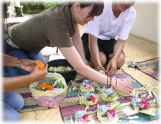 3度目のバリにしてやっとチャナン作り体験!! バリの女性が軒先で作っている綺麗なお供え物。。。 気になって作りたいと思い、こちらで体験が出来るとの事で それをきっかけに、HOUSEへ宿泊予約をしました。 |
