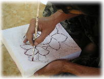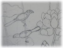 キャンバスに下絵を描いていくのに、デッサン力はもちろん必要だけど 花や葉の曲線が、どこか違うなぁ〜と線に迷っていると 「女の人がバリダンスを踊るように」とのアドバイスが。 先生は何も見ずに、どんどん描いていきます。 終わったのかと思うと 「鳥を描こうか?」という事になり、Jelatik bird も加わりました。 |