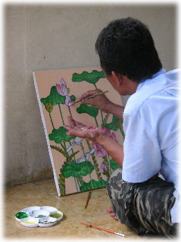 レッスンはその後、墨やアクリル絵の具で いくつかのプロセスを経て仕上げていきます。 独特なのは、竹を加工した筆を使うこと。 パレットは使うものの、筆にとった絵の具は 左手のひらにのせて加減を調整していくこと。 それからテラスであぐらをかいて座り、 キャンバスを抱えイーゼルは使わない。 |