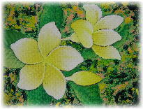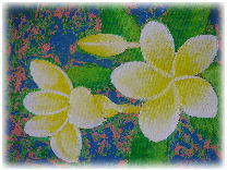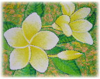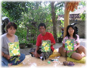 いつかはバリで絵を習いたい、と思いながら5回目のバリで叶いました。 今までは、油絵で熱帯の花々をモチーフに描いていたので プンゴセカンスタイルの絵を描く先生に来てもらうようにお願いしました。 |
